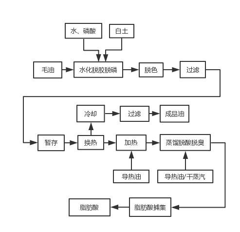 工藝流程:毛油→水化脫膠→水洗→干燥→干法脫膠→脫色→過濾→除氧→換熱→加熱→物理脫酸→延時脫色→加熱→脫臭→換熱→冷卻→成品油